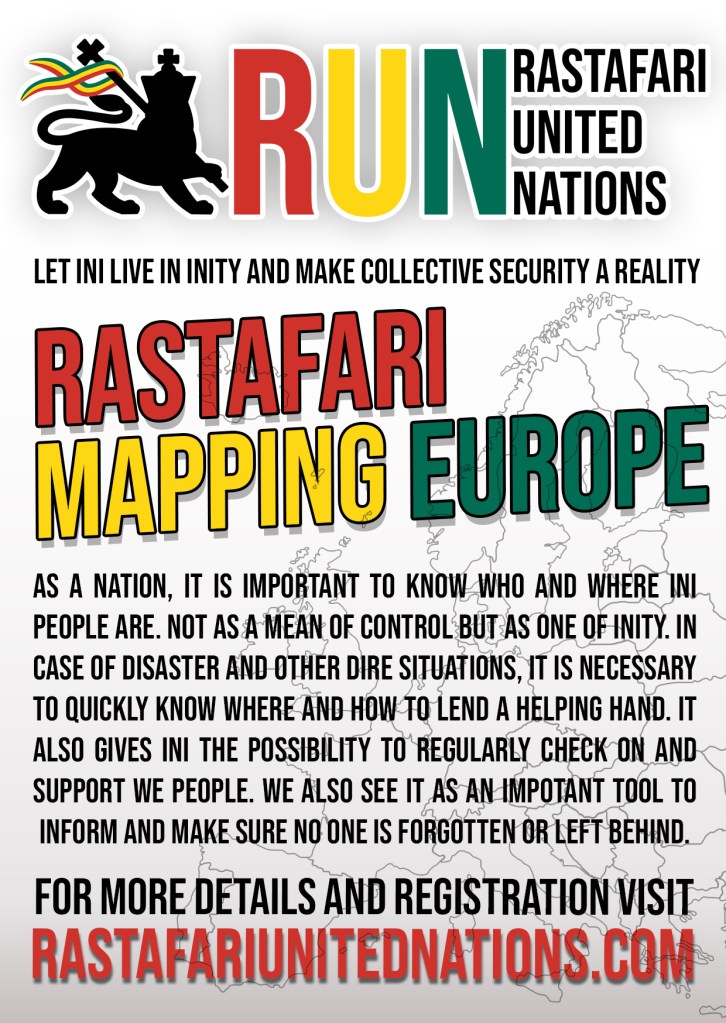 The Rastafari United Nations would like to take on the duty of mapping the Rastafari community in Europe, so that in case of an emergency we will be able to check on one another and give an helping hand where ever needed. All information gathered will be held secure and never given to a third party under any given circumstances.